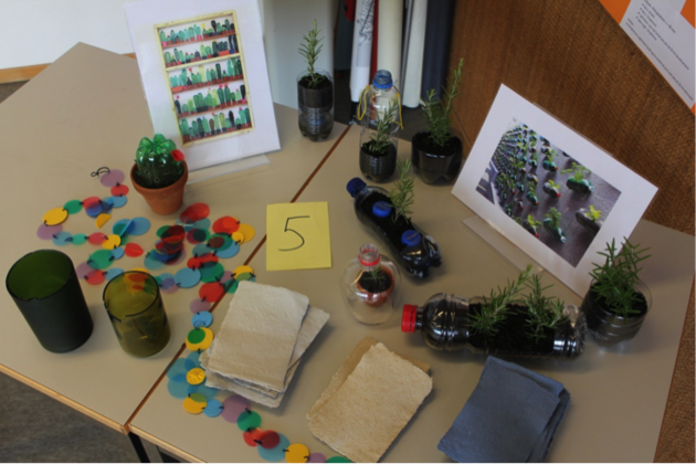 Pourquoi toujours acheter, jeter, racheter, jeter et acheter encore … ? La fabrication, le transport et finalement l’incinération après usage de nombreux matériaux que nous achetons (plastique, verre, papier) dégagent des gaz à effet de serre contribuant au réchauffement climatique et autres gaz polluants. Et si on s’engageait à jeter le moins possible et à recycler le plus possible ! C’est ce que nous avons tenté pendant trois jours en transformant des bouteilles en PET (en pots de fleurs, jardinières, serres et suspensions), des bouteilles en verre (en vases), nos vieilles pochettes plastifiées couleur (en guirlandes de fleurs), de vieux journaux et boîtes à œufs (en cartes). Petites et ludiques contributions dans la lutte contre le réchauffement de la planète !