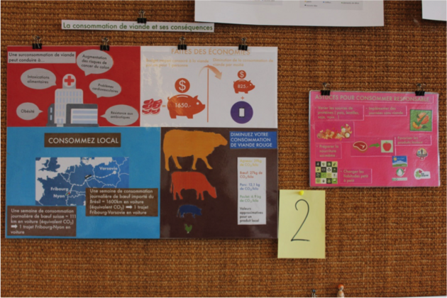 Alors que la consommation mondiale de viande ne cesse d’augmenter et que dans notre école, nombreux sont ceux qui, chaque midi vont réchauffer leurs plats aux micro-ondes, notre groupe a souhaité sensibiliser les étudiants au problème de la surconsommation de viande à travers un panneau didactique disposé dans la cafétéria. L’élevage intensif (de bovins principalement) produit une quantité très importante de méthane (CH4), un gaz à effet de serre 25 fois plus nocif que le CO₂. Par ses couleurs vives, notre panneau attire l’attention sur les différents enjeux climatiques mais aussi sanitaires et économiques, que soulève une consommation trop importante de viande.