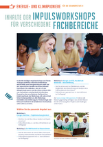 Gli studenti possono spiegare come il consumo di energia è legato al cambiamento climatico e usare vari esempi per mostrare come possono risparmiare energia e proteggere il clima nella loro vita quotidiana. Come classe, sviluppano e pianificano il proprio progetto nel campo dell'uso responsabile dell'energia e della protezione del clima e lo realizzano dopo il workshop d'impulso.