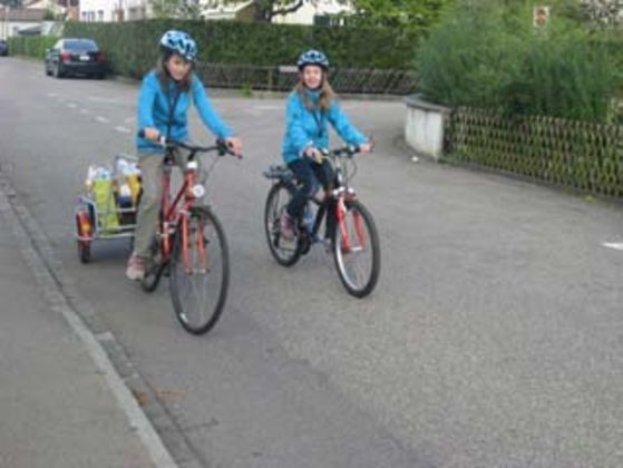 Wir sind zwei Mädchen vom Igel-Club (Begabtenförderung Münchenstein) und wollten für Leute aus unseren Quartieren die anfallenden leeren PET-Flaschen, Altglas, Blech und alte Batterien entsorgen, damit sie diese voluminösen Abfälle nicht extra mit dem Auto zu den Sammelstellen fahren müssen und so keine zusätzlichen umweltschädigenden Abgase produziert werden. Zuerst kündeten wir unseren Dienst mit einem Flugblatt und telefonischer Buchung an. Da sich jedoch kaum jemand getraute anzurufen, zogen wir an einem Samstagmorgen mit unserem Veloanhänger los und klingelten an vielen Haustüren. Innert kürzester Zeit sammelten wir so riesige Berge von Abfall.