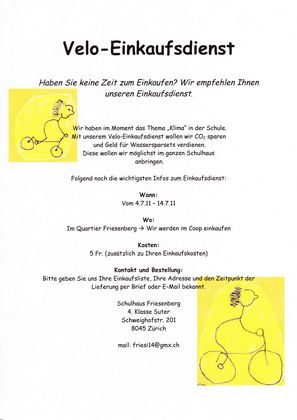 Wir Schüler und Schülerinnen der 5.Klasse vom Schulhaus Friesenberg aus Zürich haben einen Velo-Einkaufsdienst gemacht. Dazu haben wir die Leute in unserem Quartier mit Flyern (welche wir in den Briefkästen verteilt haben) auf unser Angebot aufmerksam gemacht. Die Bestellung konnte dann per Mail oder Post aufgegeben werden. Wir gingen während der Schulzeit und teils auch in unserer Freizeit einkaufen. Bei jedem Einkauf verdienten wir 5 Fr. Dieses Angebot machten wir insgesamt vier Wochen lang. Wir waren sehr fleissig, hatten aber leider nur sehr wenig Kunden. Trotzdem konnten wir durch dieses Projekt einige Autokilometer einsparen und zusätzlich Geld für die von uns geplanten Wassersparsets im Schulhaus sammeln.